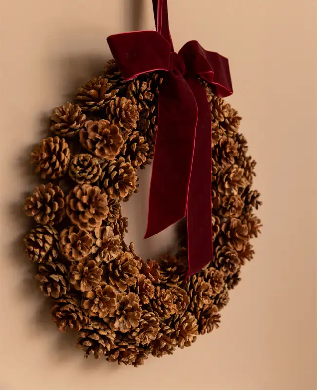 Un’elegante ghirlanda decorata con pigne e impreziosita da un raffinato fiocco in velluto. Un dettaglio senza tempo che scalda l’atmosfera e dona charme a porte, pareti e vetrine natalizie.