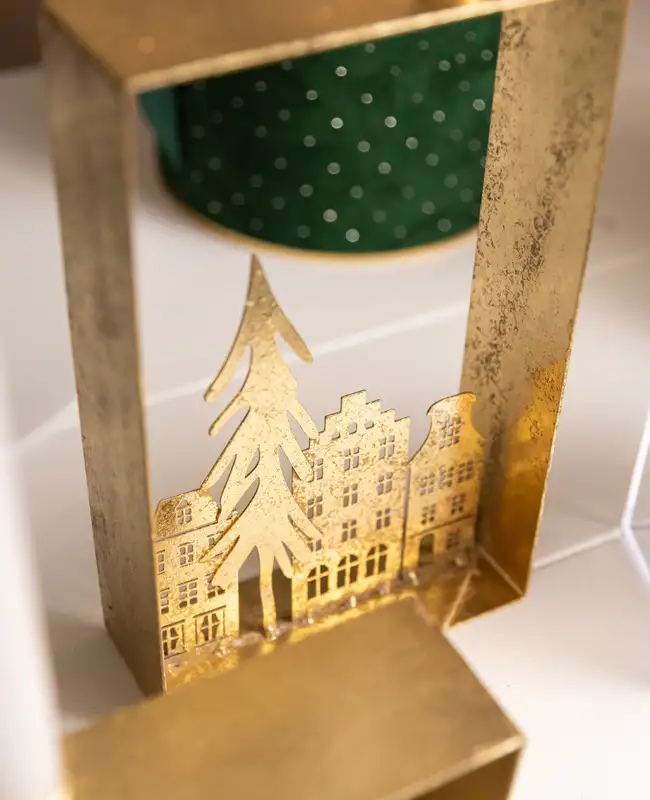 Un portacandele prezioso in metallo oro, decorato con il profilo di un paesaggio natalizio con alberi innevati. Perfetto per illuminare gli spazi con calore e suggestione.