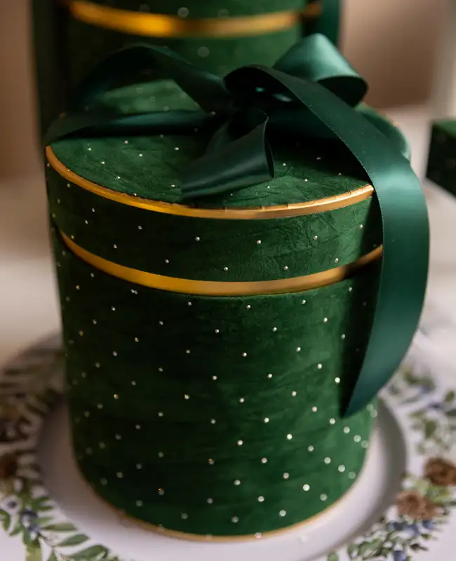 Complemento d’arredo in velluto verde con delicati pois dorati e finiture eleganti. Disponibile in diverse forme e dimensioni, dona raffinatezza e originalità a tavole e ambienti