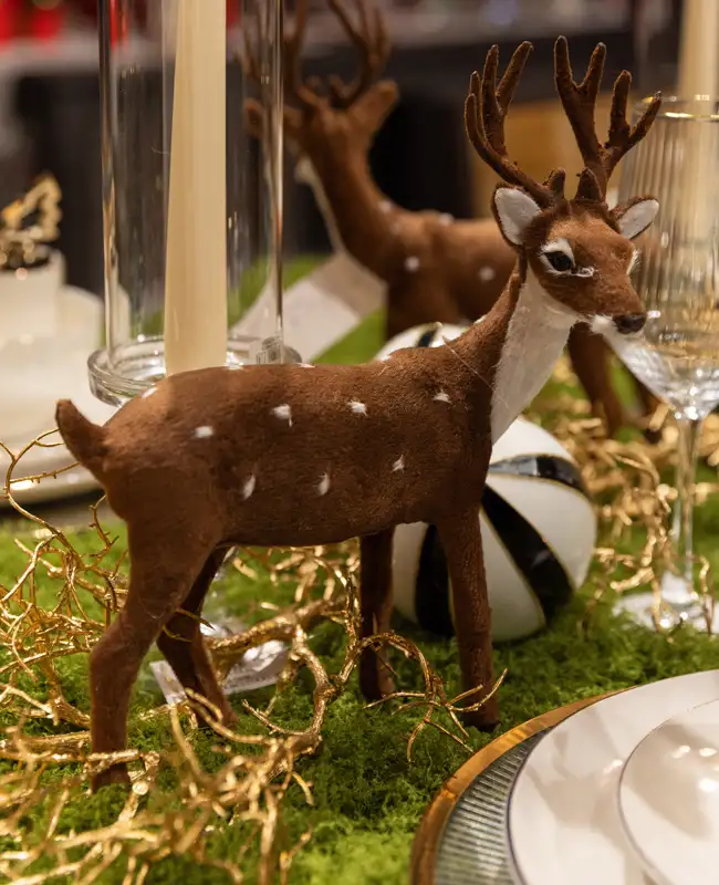 Decorazione realistica a forma di cerbiatto, con pelo sintetico morbido. Un tocco naturale e delicato che crea un’atmosfera bucolica e accogliente.