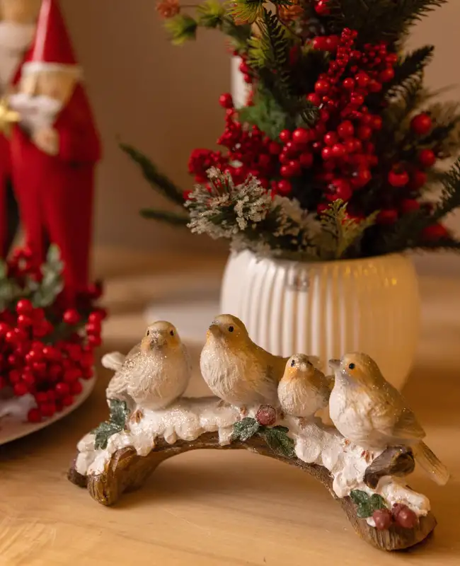 Decorazione in ceramica che raffigura un ramoscello innevato con piccoli uccellini appollaiati. Un dettaglio delicato che richiama la magia invernale.
