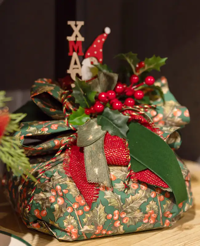 • fiocchi, nastri e decorazioni come pigne, bacche, agrifogli, fiori e foglie plastificate, in nuance che richiamano la bellezza della natura.