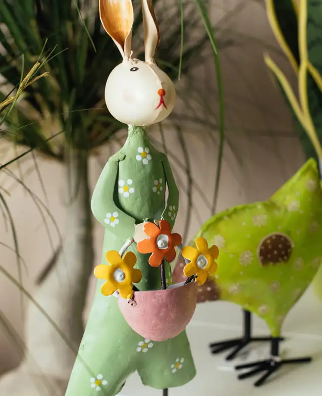 Coniglio decorativo in metallo, dal design colorato e vivace, ideale per portare un tocco primaverile e bucolico agli allestimenti. Disponibile in diverse dimensioni e colori, aggiunge originalità a composizioni, centrotavola e scenografie a tema country.