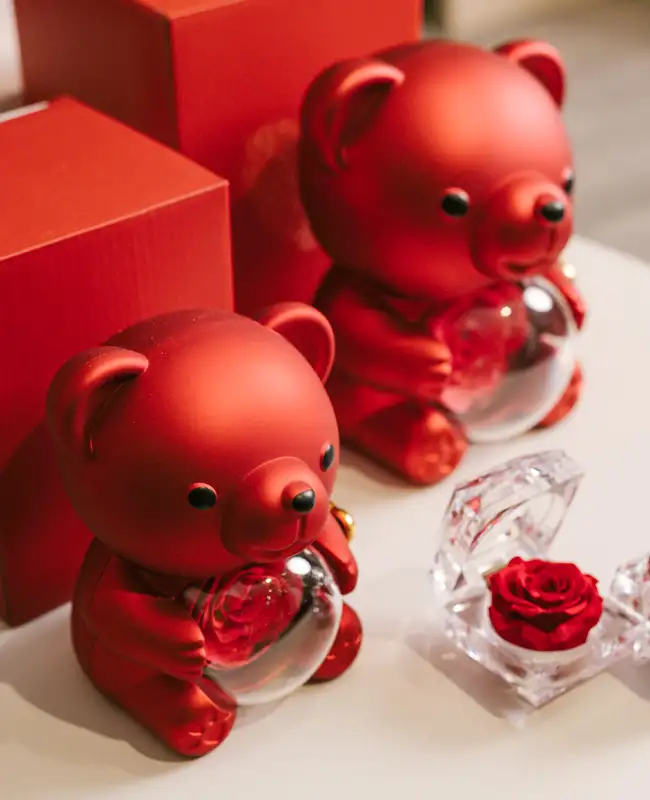 Orsetto con finitura rosso metallizzato, con rosa stabilizzata, ideale come oggetto decorativo per vetrine, negozi ed eventi speciali. Al suo interno contiene una rosa vera stabilizzata racchiusa in una sfera trasparente, che mantiene il suo aspetto nel tempo senza necessità di cure. Un complemento decorativo perfetto per San Valentino, cerimonie e allestimenti a tema amore.