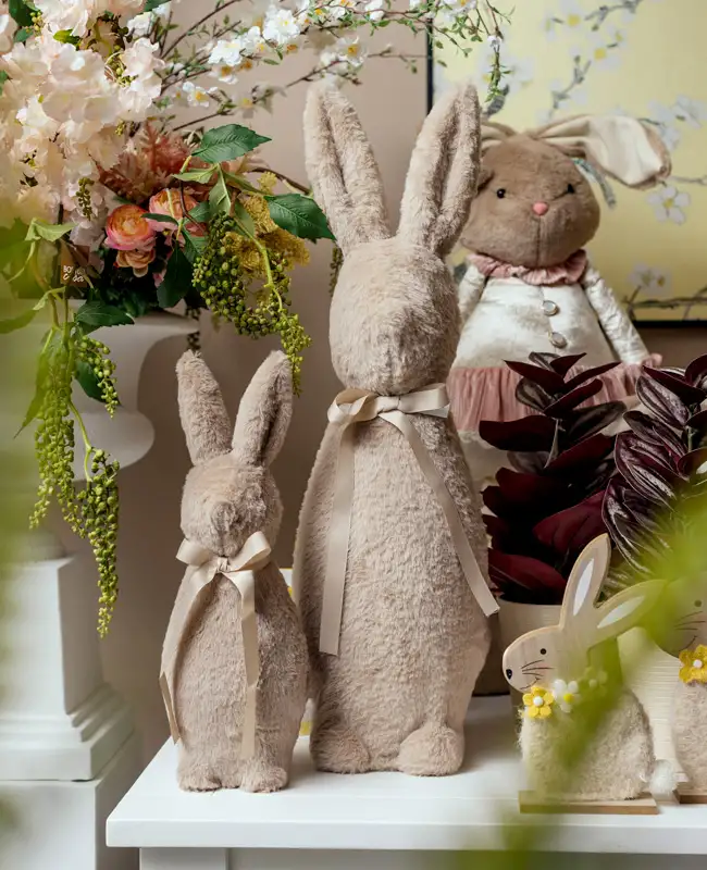 Coniglietti decorativi realizzati in morbido peluche, impreziositi da un fiocchetto in raso. Perfetti per allestimenti pasquali e primaverili e per vetrine dallo stile giocoso e creativo. Disponibili in diverse dimensioni.