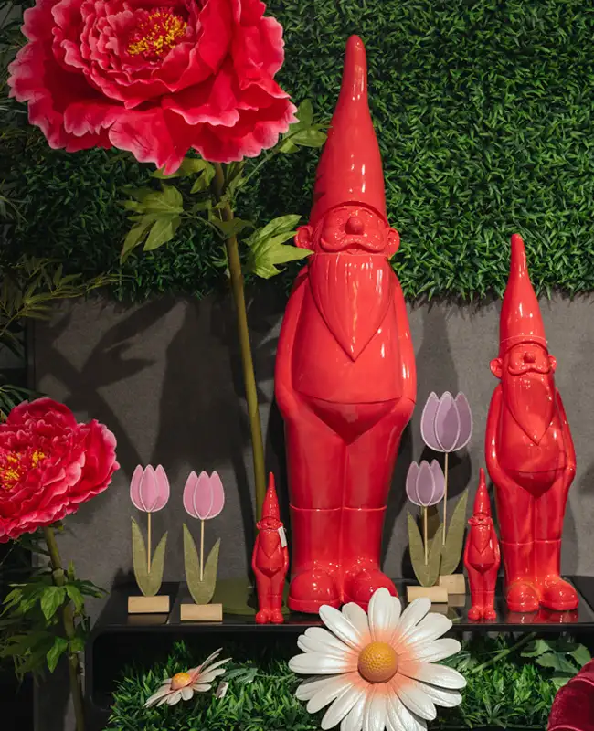 Statuina di design a forma di gnomo da giardino, realizzata in ceramica smaltata color rosso. Perfetta per aggiungere un tocco fiabesco e giocoso ai tuoi allestimenti. Disponibile in diversi colori e dimensioni.