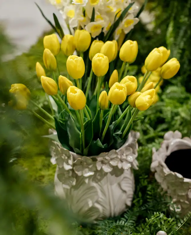 Tulipani galli artificiali, perfetti per centrotavola, decorazioni e composizioni primaverili. Aggiungono un tocco di allegria e colore agli allestimenti. Disponibili in diverse tonalità.