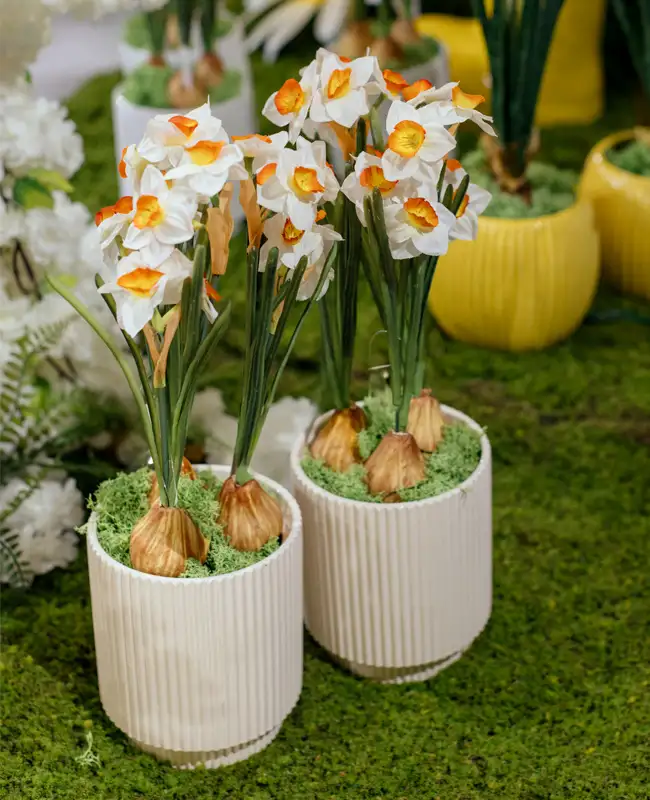Narcisi artificiali con bulbo, perfetti per centrotavola, decorazioni e composizioni primaverili. Aggiungono un tocco bucolico e colorato agli allestimenti. Disponibili in diverse tonalità.