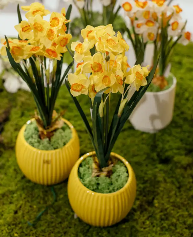 Narcisi artificiali con bulbo, perfetti per centrotavola, decorazioni e composizioni primaverili. Aggiungono un tocco bucolico e colorato agli allestimenti. Disponibili in diverse tonalità.
